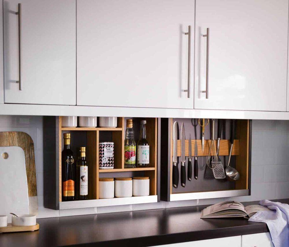 8. Ruang sisa antar kabinet bisa kamu manfaatkan untuk menyimpan barang-barang tipis seperti loyang, talenan, hingga nampan