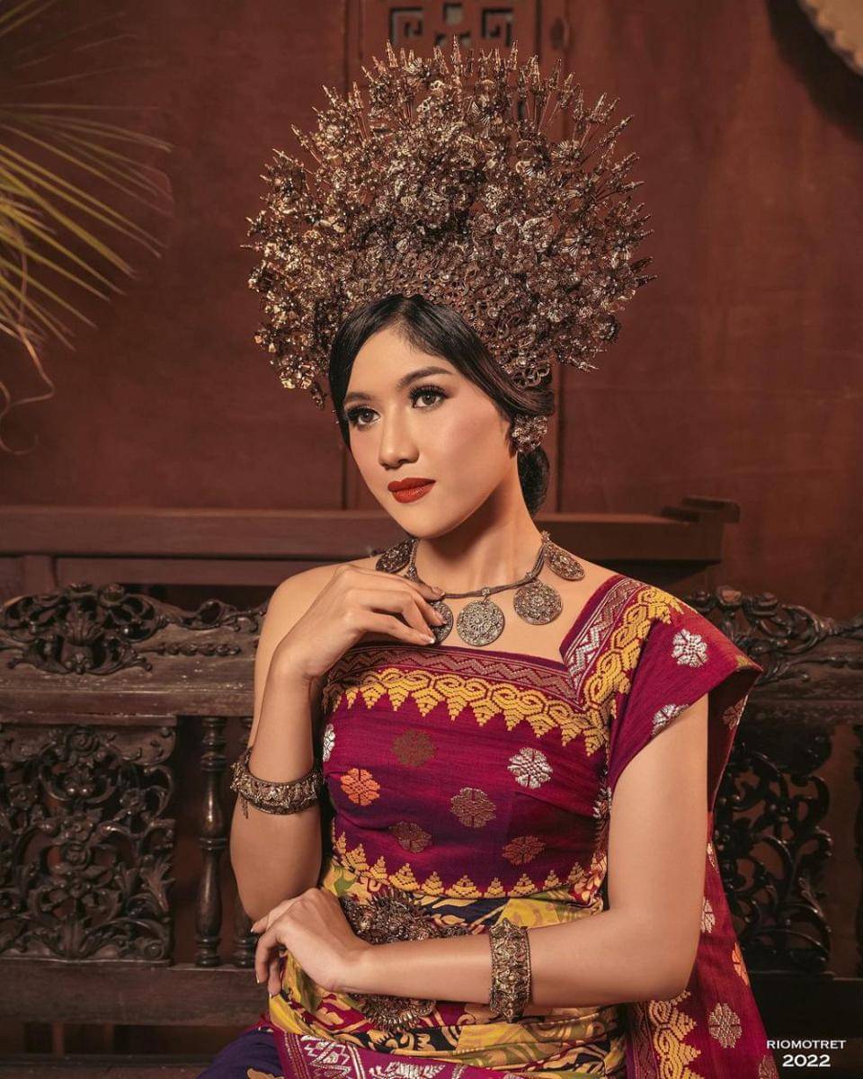 4. Erina memakai kain adat Lampung perpaduan Saibatin dan Pepadun. Dengan lilitan kain tipisnya, tak lupa siger sebagai riasan kepalanya yang berasal dari adat Saibatin