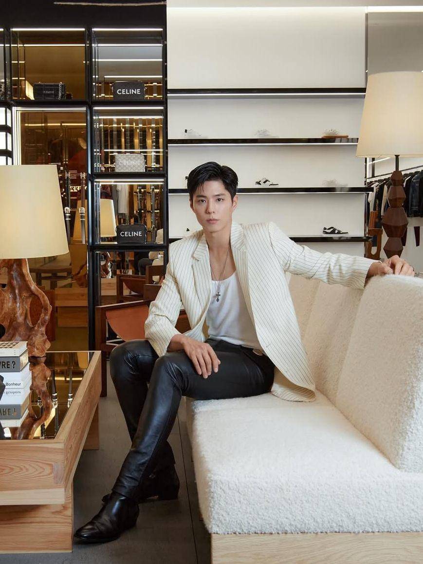 6. Outfit formal juga ditampilkan Park Bo Gum lewat set leather blazer dan leather ankle trousers, shirt, neck tie, dan boots senada. Klasik tapi timeless!
