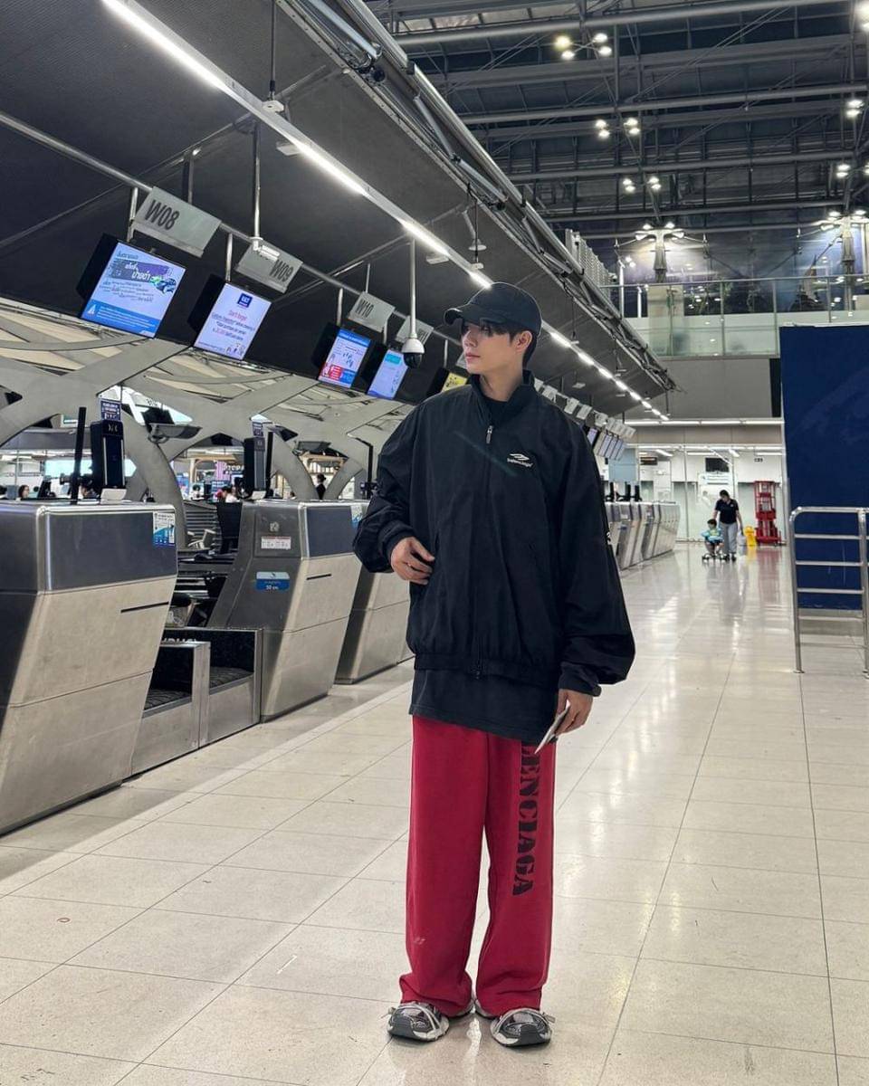 2. Zee Pruk juga mengombinasikan casual loose pants dengan graphic tee hitam beserta jaket bomber denim, baseball cap dan sneakers sporty