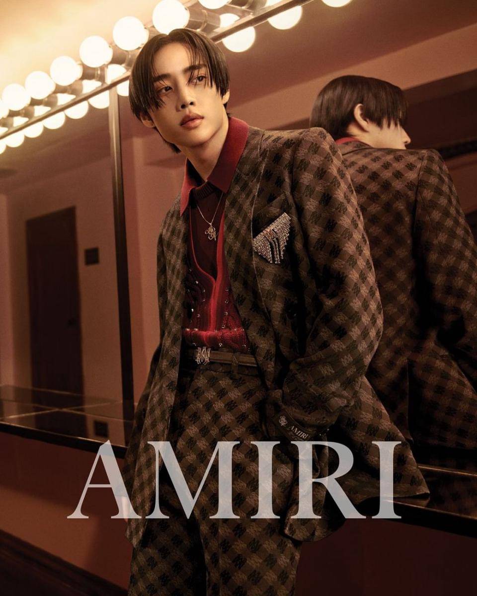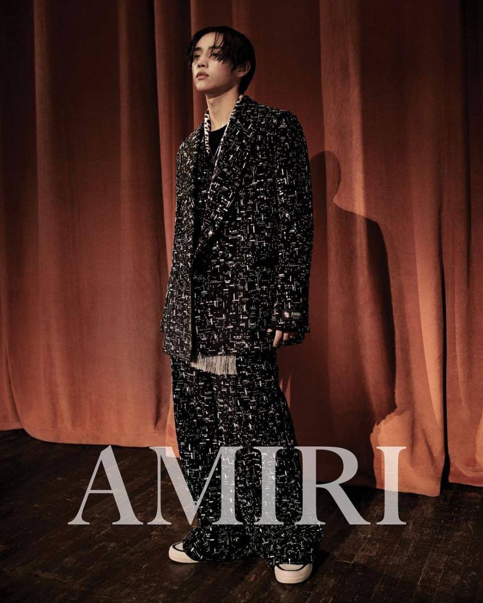 5. Formal elegan, Sunwoo kenakan set loose blazer dan trousers lengkap dengan printed shirt. Detail benang metalik nuansa gold super catchy!