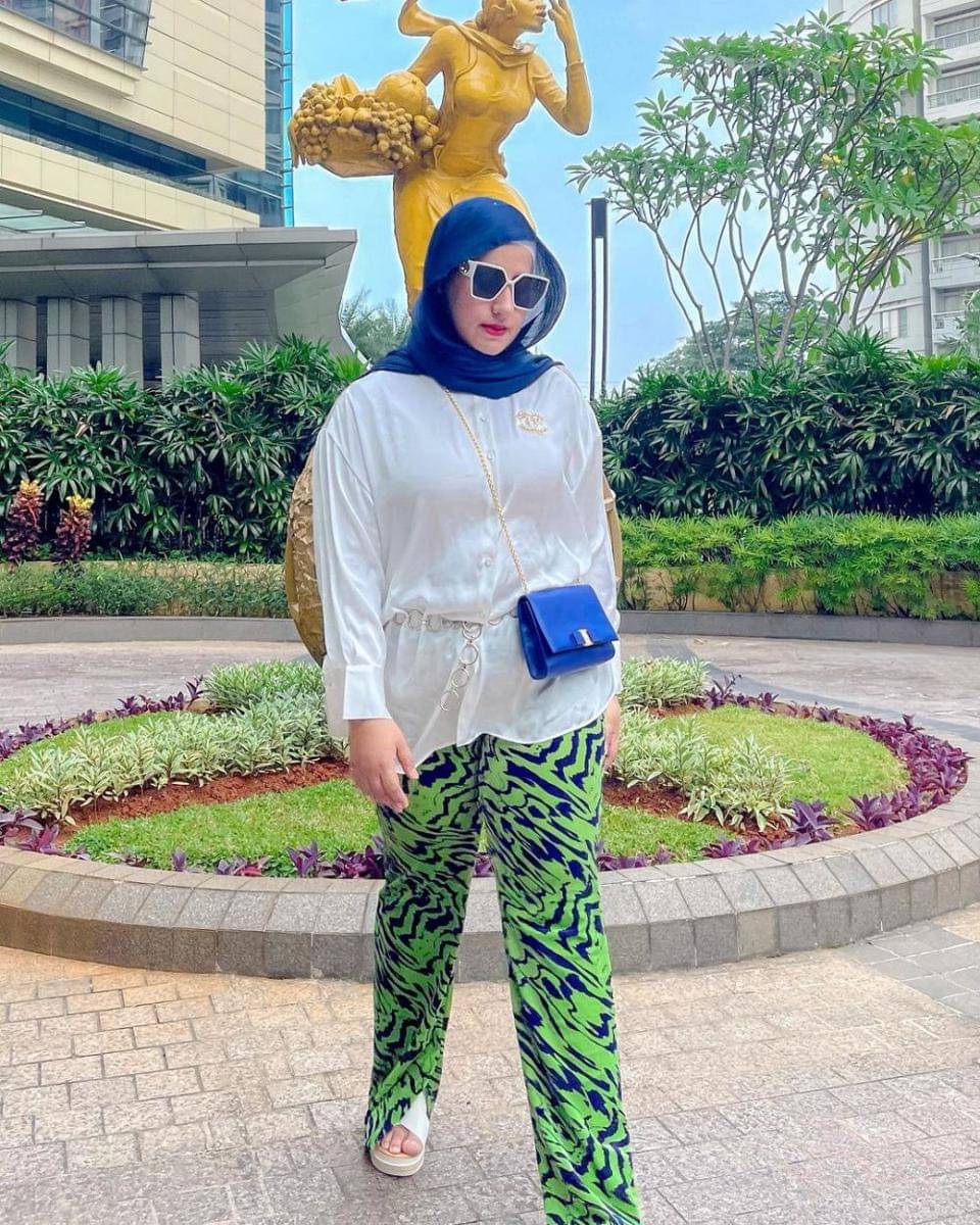 5. Ingin tampil beda? Coba kemeja hijau terang dengan kombinasi kulot cokelat dan hijab putih, seperti tampilan Tasyi berikut