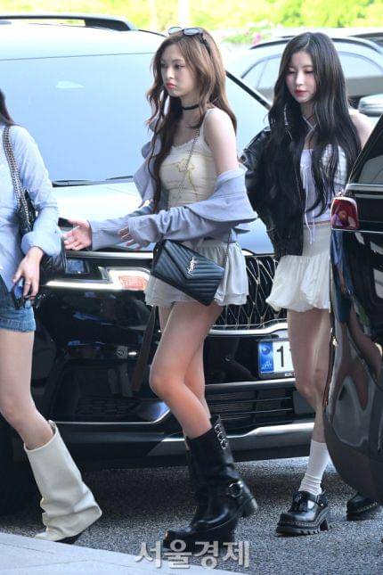 4. Dengan outfit simple kemeja dan denim mini skirt, Ahyeon pilih layered leather boots untuk dijadikan sebagai alas kakinya. Edgy abis!