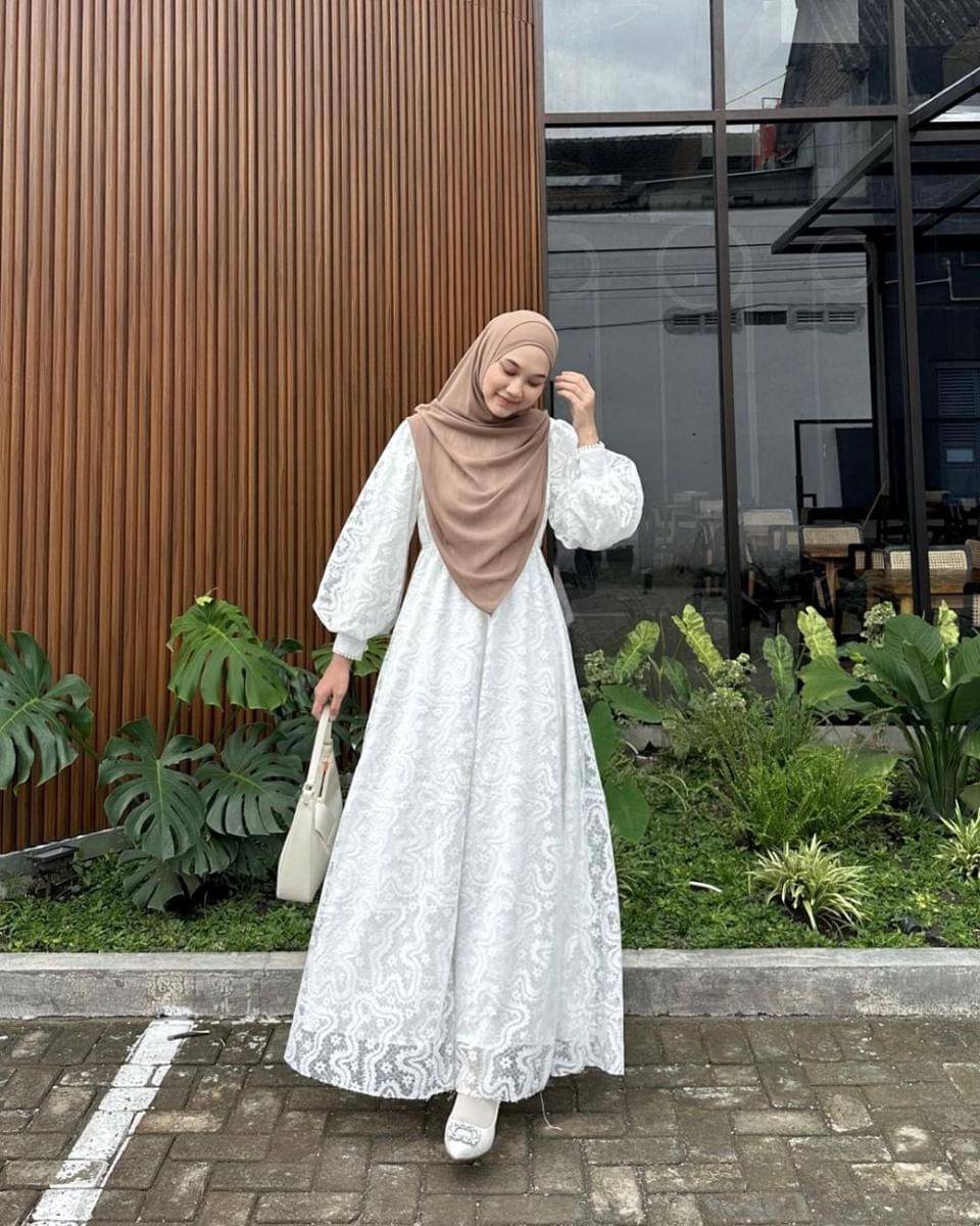 1. Pakai dress full brokat bernuansa putih dengan model lengan puff ini tak kalah stunning untuk dijadikan gaya andalan pergi ke kondangan