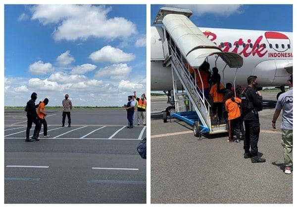 "Kondisi 23 tersangka terorisme ini dalam keadaan sehat. Satu persatu dikeluarkan dari bus menuju pesawat. Mereka dikawal anggota di kanan kiri depan belakang mengenakan (senjata) laras panjang," kata Pandra.